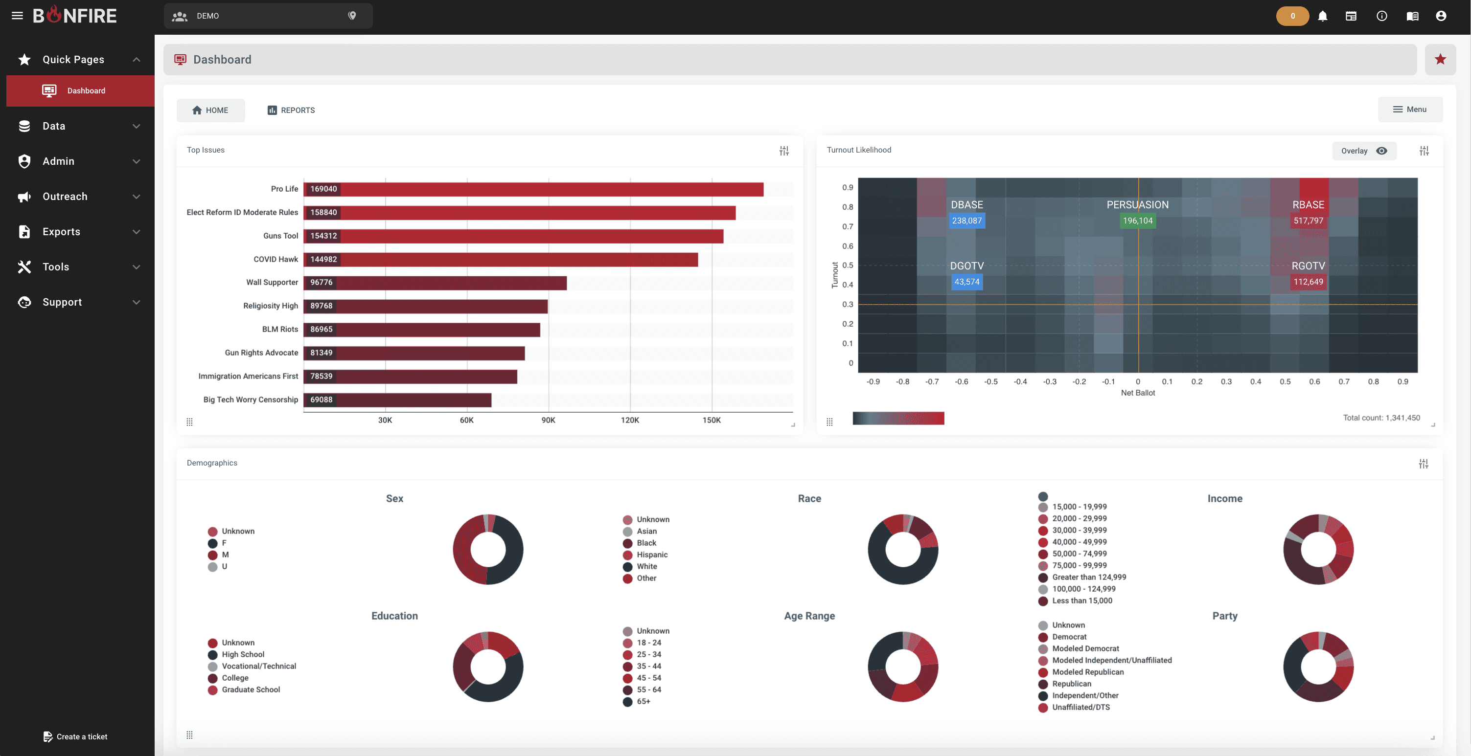 Bonfire is an innovative user-friendly data management, visualization, and exploration platform designed to offer unrivaled intelligence to political campaigns/committees, non-profits, advocacy groups, strategists, and anyone seeking voter insights.